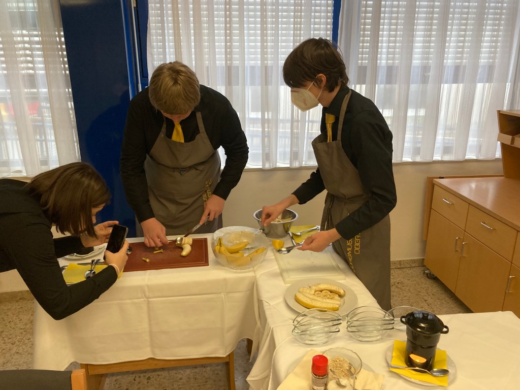 Die Schüler*innen der 2HLT-Kochgruppe versuchten erstmals kalte Vorspeisen wie zum Beispiel Vitello Tonnato, Hühnerterrine, Beef Tartar und Salat Waldorf mit geräucherter Entenbrust. Die gelungenen Köstlichkeiten wurden von der Service-Gruppe „en voiture“ präsentiert. Für die Schüler*innen waren diese Einheiten nicht nur lehrreich, sondern vor allem sehr schmackhaft!