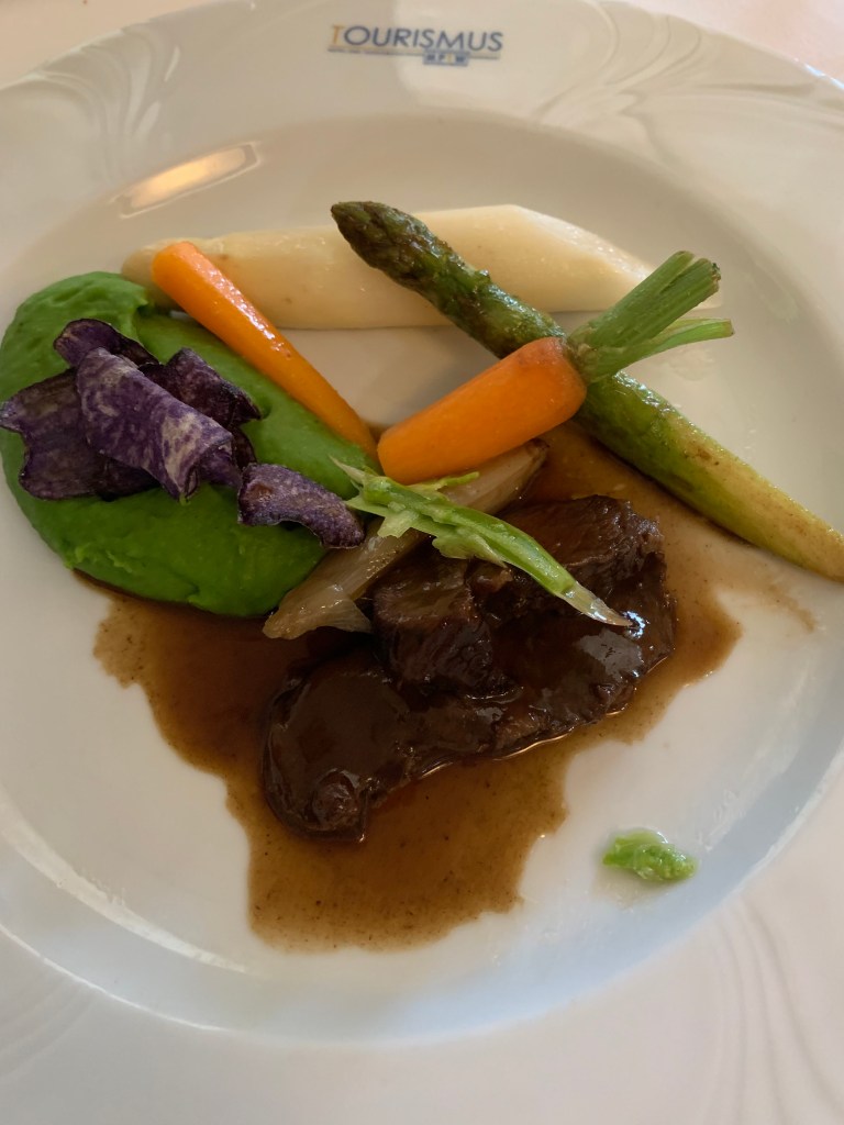Eltern und Familie der Prüfungskandidat*innen, Absolvent*innen und geladene Gäste aus dem Tourismus- und Medienbereich waren von den Kochkünsten und dem charmanten und professionellen Service der Schüler*innen begeistert. Kein Wunder, denn Ziegenfrischkäsemousse & Rote Rüben/Tartar, Zander mit Speck/Kräuterravioli in der Suppe, Moorochsenbackerl mit köstlichen Gemüsevarianten und als Abschluss eine moderne Interpretation der Besoffenen Liesl treffen einfach Geschmack und Zeitgeist.
